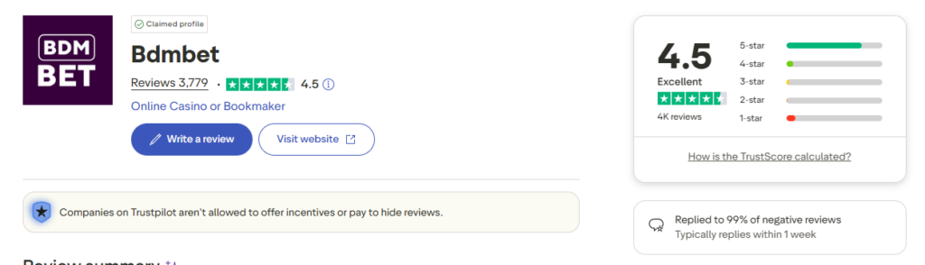 This positive Trustpilot score aligns perfectly with our own review: BDMBet is a reliable operator where your money is safe.