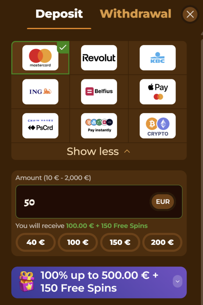 Both digital wallet enthusiasts and cardholders can deposit or withdraw using popular solutions such as Apple Pay, Google Pay, Visa, Mastercard, Bitcoin, Ethereum, Tether, and others.